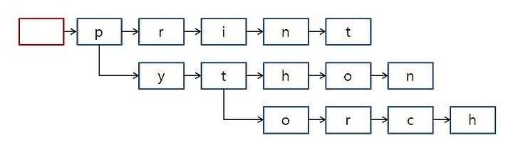 붉은색의 루트노드에서 p가 파생되고 print의 p를 제외한 부분이 하나의 가지를 이루며, python의 ython이 또 하나의 가지를 이루고 pytorch의 pyt를 제외한 orch 부분이 하나의 가지를 이루게 된다.